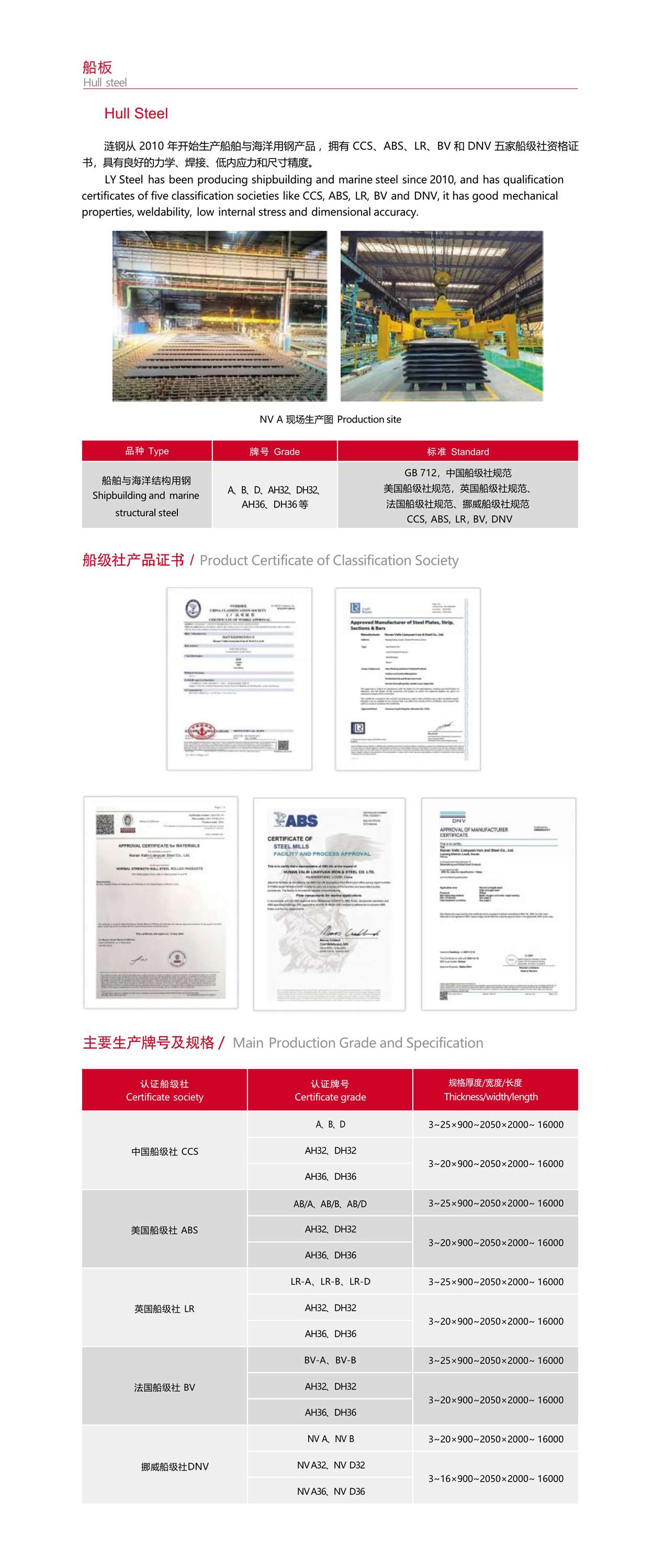 漣鋼從 2010 年開始生產(chǎn)船舶與海洋用鋼產(chǎn)品 ,擁有 CCS、ABS、LR、BV 和 DNV 五家船級(jí)社資格證 書,具有良好的力學(xué)、焊接、低內(nèi)應(yīng)力和尺寸精度。