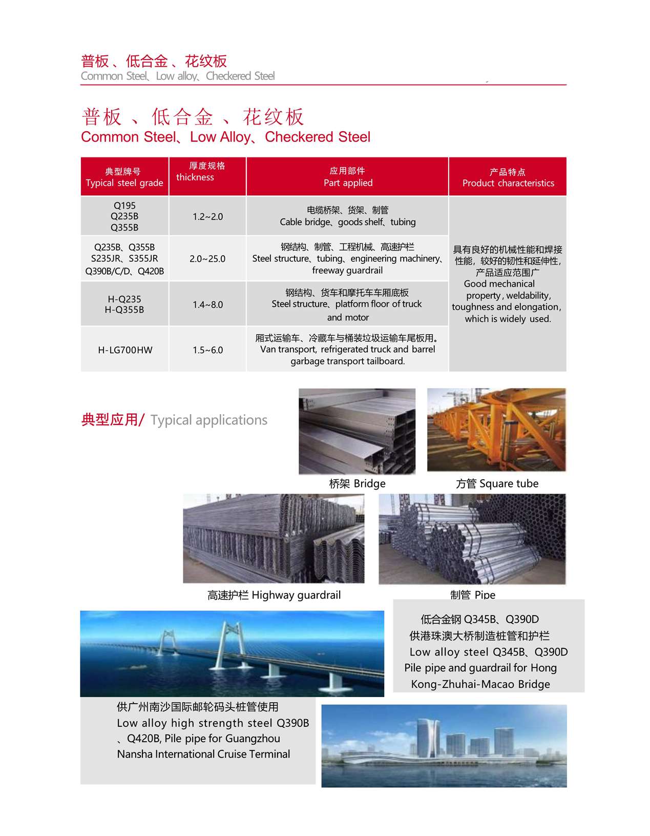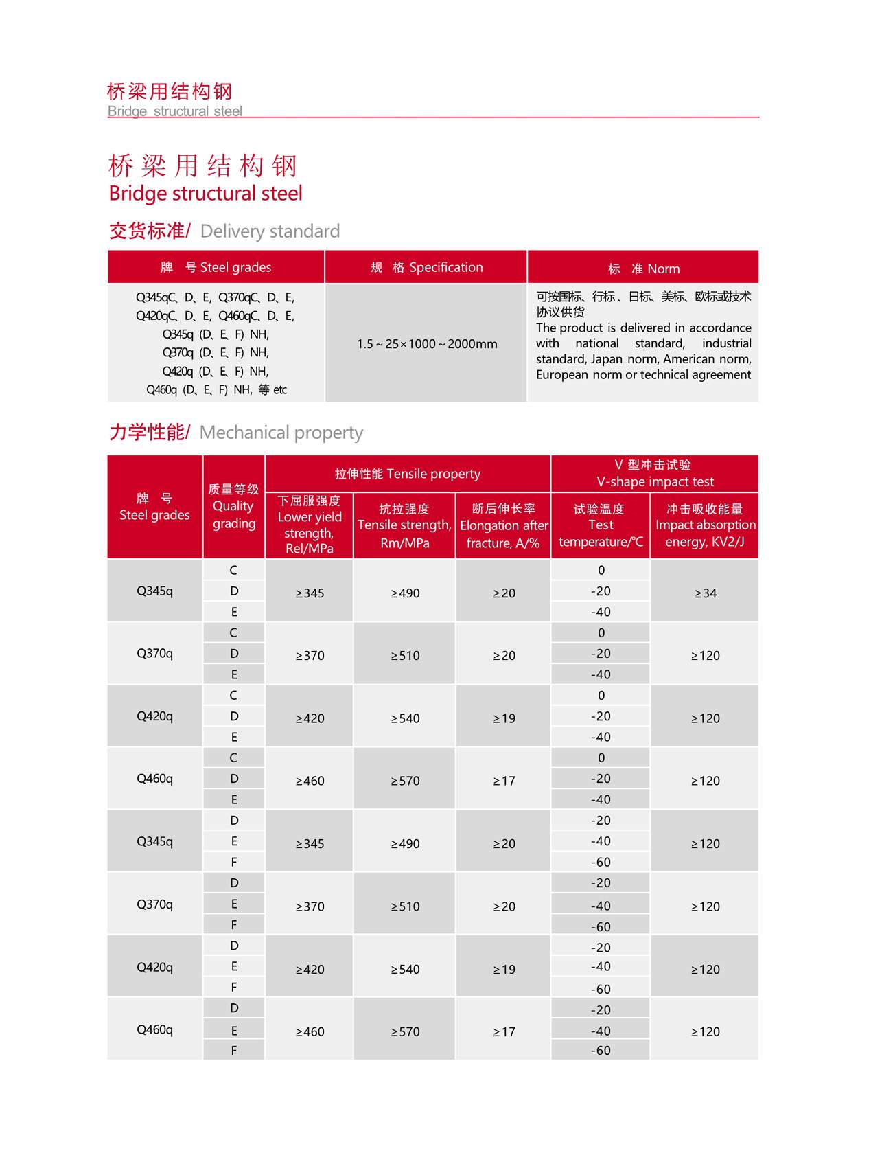 橋梁鋼具有較高的強(qiáng)度、韌性以及承受機(jī)車車輛的載荷和沖擊,有良好的抗疲勞性、一定的低溫韌性和耐大氣腐蝕性,鋼材的表面質(zhì)量要求較高;公司可供Q345~Q460強(qiáng)度等級(jí)橋梁及耐候橋梁鋼,可按國標(biāo)、行標(biāo)、日標(biāo)、美標(biāo)、歐標(biāo)或技術(shù)協(xié)議供貨。