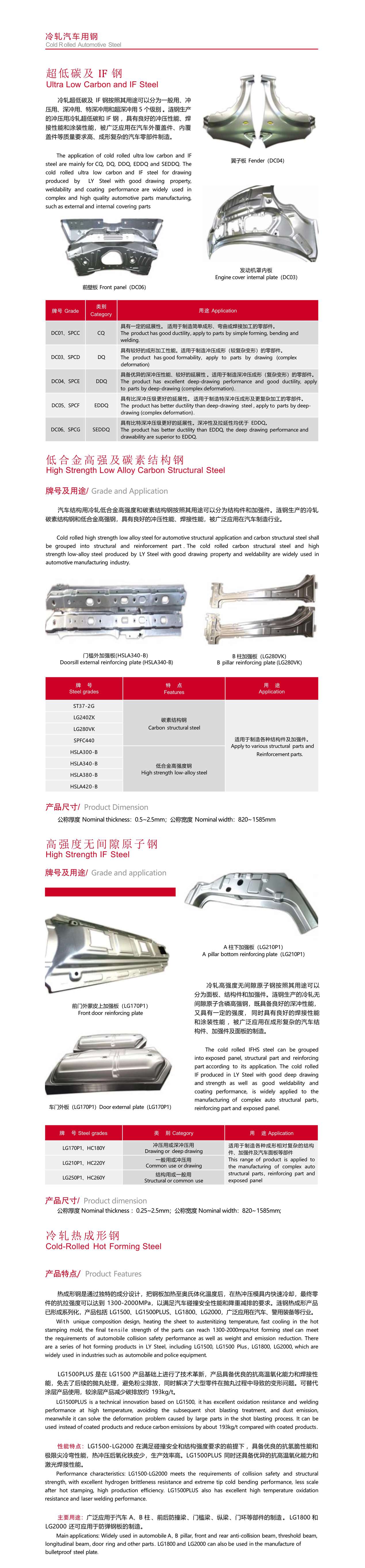 冷軋超低碳及 IF 鋼按照其用途可以分為一般用、沖 壓用、深沖用、特深沖用和超深沖用 5 個(gè)級(jí)別 。漣鋼生產(chǎn) 的沖壓用冷軋超低碳和 IF 鋼 ,具有良好的沖壓性能、焊 接性能和涂裝性能,被廣泛應(yīng)用在汽車外覆蓋件、內(nèi)覆 蓋件等質(zhì)量要求高、成形復(fù)雜的汽車零部件制造。