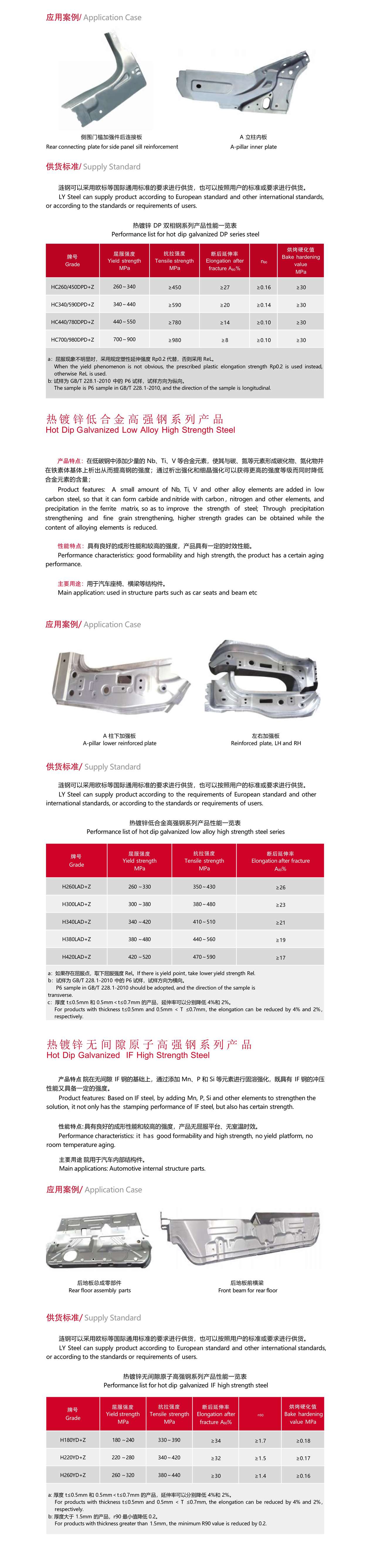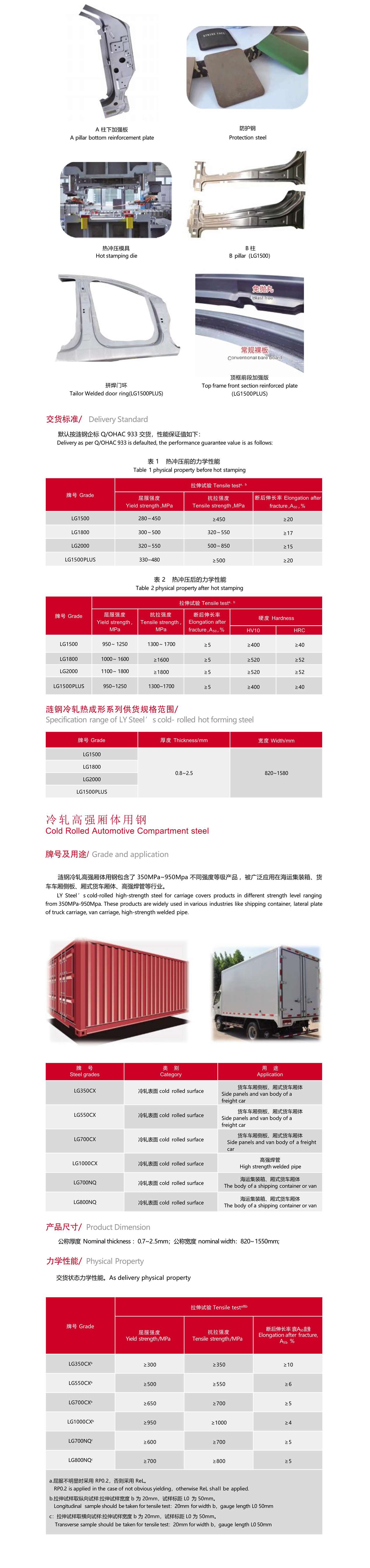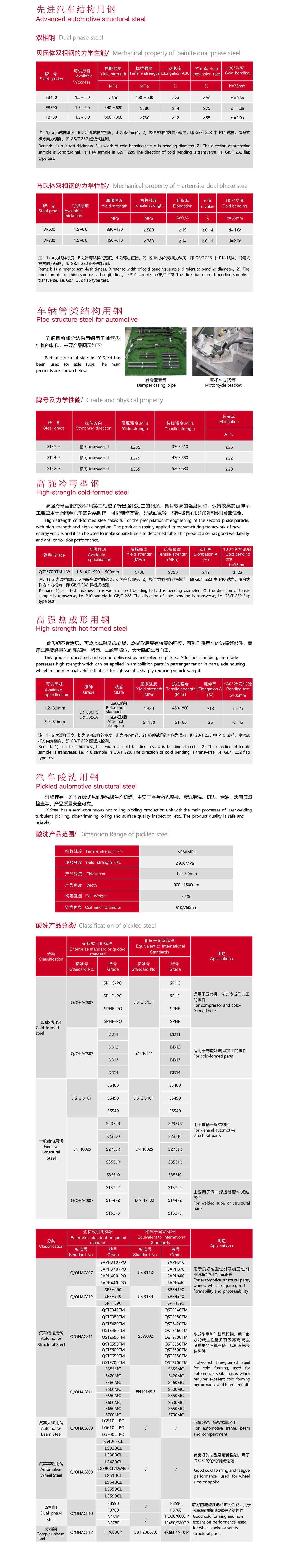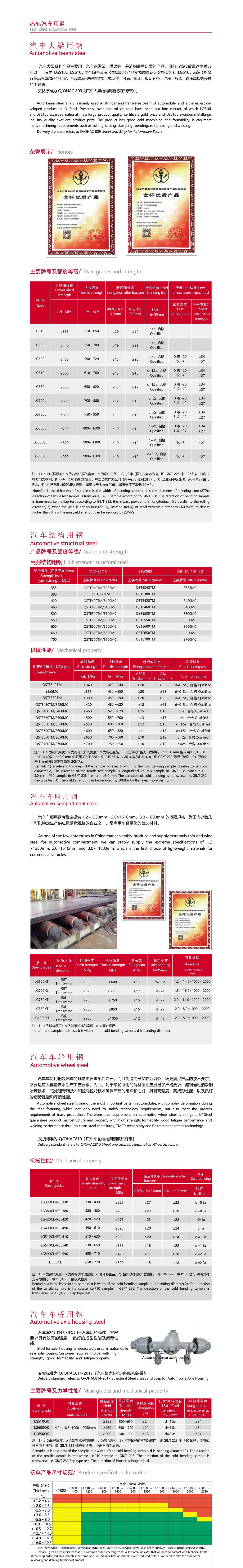 汽車大梁系列產(chǎn)品主要用于汽車的縱梁、橫梁等,是漣鋼最早研發(fā)的產(chǎn)品,目前市場投放量達(dá)到百萬 噸以上,其中 LG510L LG610L 兩個(gè)牌號(hào)榮獲《國家冶金產(chǎn)品實(shí)物質(zhì)量認(rèn)證金杯獎(jiǎng)》和 LG510L 榮獲《冶金 行業(yè)品質(zhì)卓越產(chǎn)品》獎(jiǎng)。產(chǎn)品具有良好的冷加工成型性,可滿足剪切、縱切分條、沖壓、折彎、輥壓焊接等多種 加工要求。