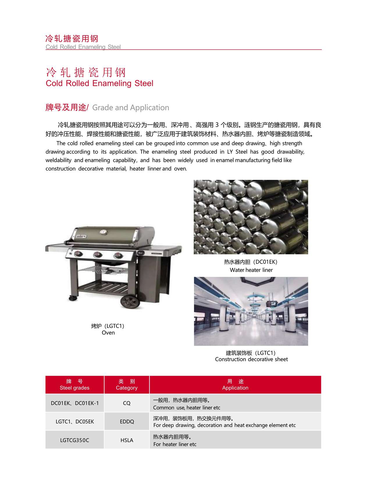 冷軋?zhí)麓捎娩摪凑掌溆猛究梢苑譃橐话阌?、深沖用 、高強(qiáng)用 3 個(gè)級(jí)別。漣鋼生產(chǎn)的搪瓷用鋼,具有良 好的沖壓性能、焊接性能和搪瓷性能,被廣泛應(yīng)用于建筑裝飾材料、熱水器內(nèi)膽、烤爐等搪瓷制造領(lǐng)域。