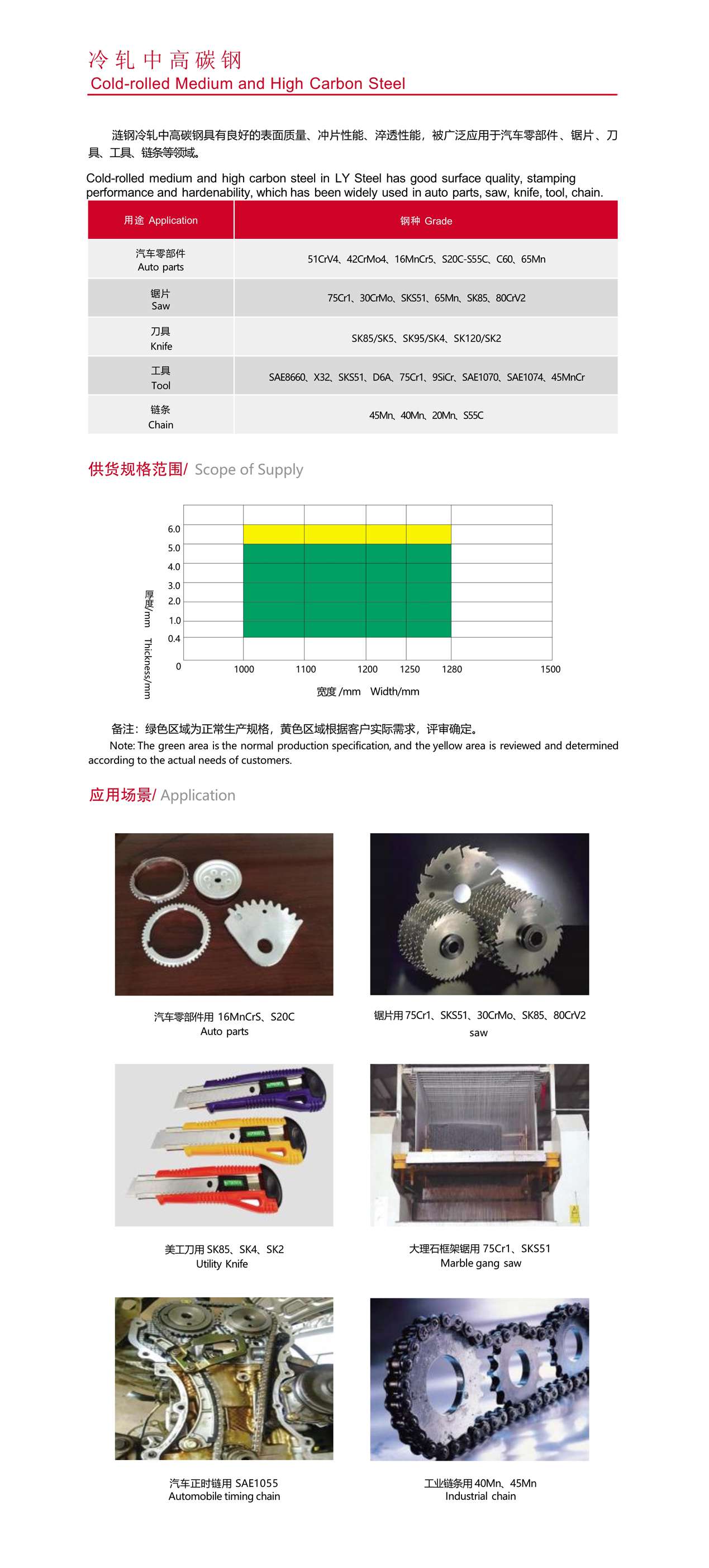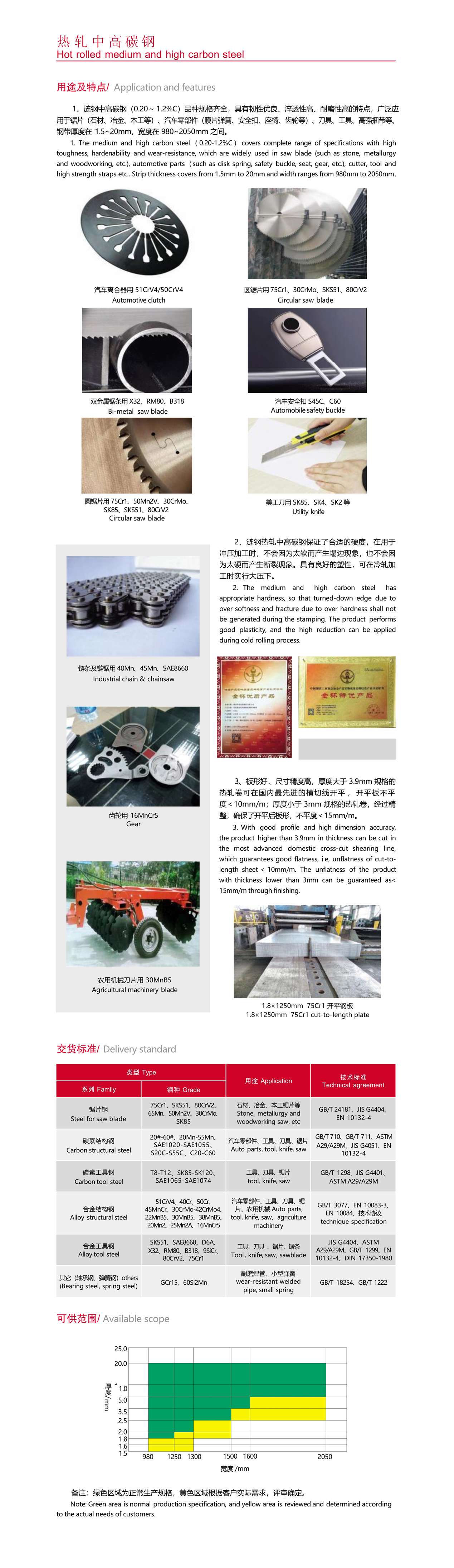漣鋼中高碳鋼(0.20~ 1.2%C)品種規(guī)格齊全,具有韌性優(yōu)良、淬透性高、耐磨性高的特點(diǎn),廣泛應(yīng) 用于鋸片(石材、冶金、木工等)、汽車零部件(膜片彈簧、安全扣、座椅、齒輪等)、刀具、工具、高強(qiáng)捆帶等。 鋼帶厚度在 1.5~20mm,寬度在 980~2050mm 之間。