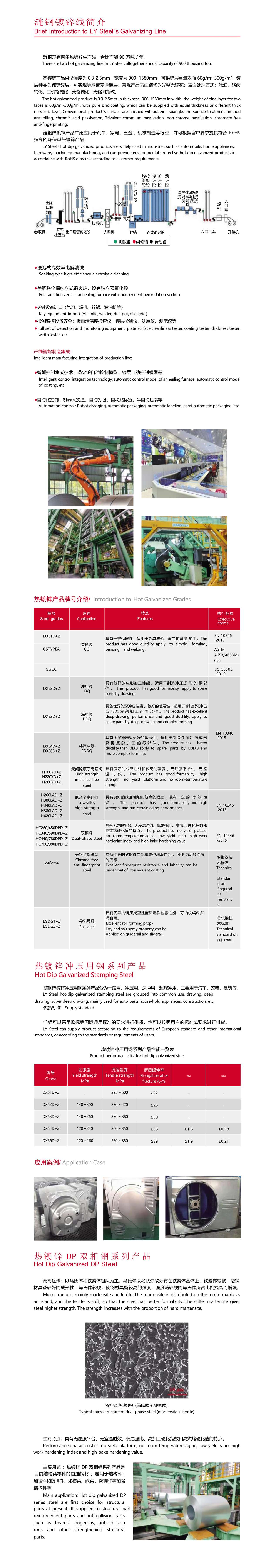 熱鍍鋅產(chǎn)品供貨厚度為 0.3-2.5mm,寬度為 900- 1580mm;可供鋅層重量雙面 60g/m2-300g/m2,鍍 層種類為純鋅鍍層,可實(shí)現(xiàn)等厚或差厚鍍層;常規(guī)產(chǎn)品表面結(jié)構(gòu)為光整無鋅花;表面處理方式:涂油、鉻酸 鈍化、三價(jià)鉻鈍化、無鉻鈍化、無鉻耐指紋。