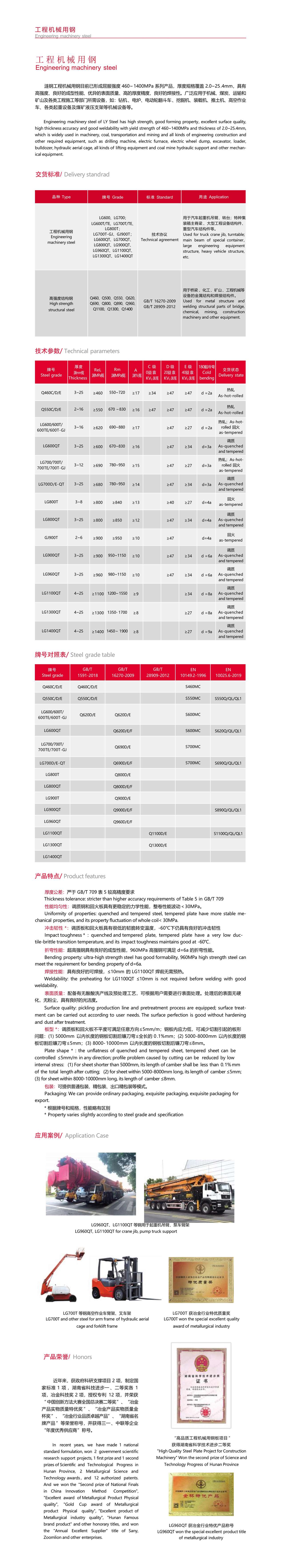 漣鋼工程機(jī)械用鋼目前已形成屈服強(qiáng)度 460~ 1400MPa 系列產(chǎn)品,厚度規(guī)格覆蓋 2.0~25 .4mm,具有 高強(qiáng)度、良好的成型性能、優(yōu)異的表面質(zhì)量、高的厚度精度、良好的焊接性。廣泛應(yīng)用于機(jī)械、煤炭、運(yùn)輸和 礦山及各類工程施工等部門所需設(shè)備,如:鉆機(jī) 、電爐、電動(dòng)輪翻斗車 、挖掘機(jī)、裝載機(jī)、推土機(jī)、高空作業(yè) 車、各類起重設(shè)備及煤礦液壓支架等機(jī)械設(shè)備等。