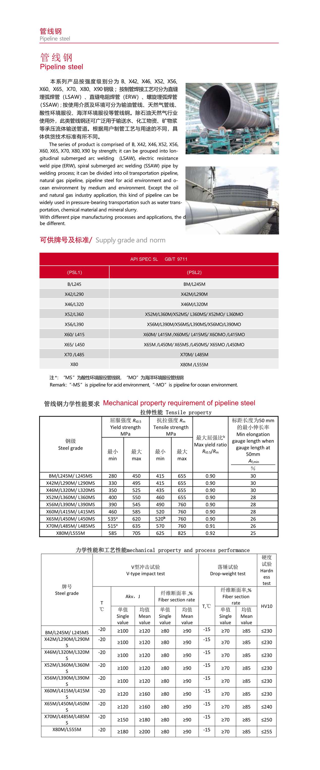 本 系 列 產(chǎn) 品 按 強(qiáng) 度 級(jí) 別 分 為 B、X42、X46、X52、X56、X60、X65、X70、X80、X90 鋼級(jí) ;按制管焊接工藝可分為直縫埋弧焊管(LSAW)、直縫電阻焊管(ERW)、螺旋埋弧焊管(SSAW);按使用介質(zhì)及環(huán)境可分為輸油管線、天然氣管線、酸性環(huán)境服役、海洋環(huán)境服役等管線鋼。